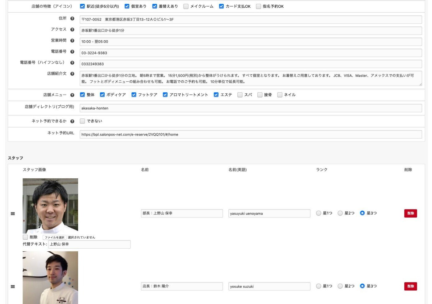 内観を見せるスライダーには、好きな枚数登録できるようになっていたり、店舗の特徴にチェックを入れることでそれぞれの項目に応じたアイコンが表示される様にしました。 また、働いているスタッフの部分も顔写真、名前、スタッフのランクまで設定できるようになっています。