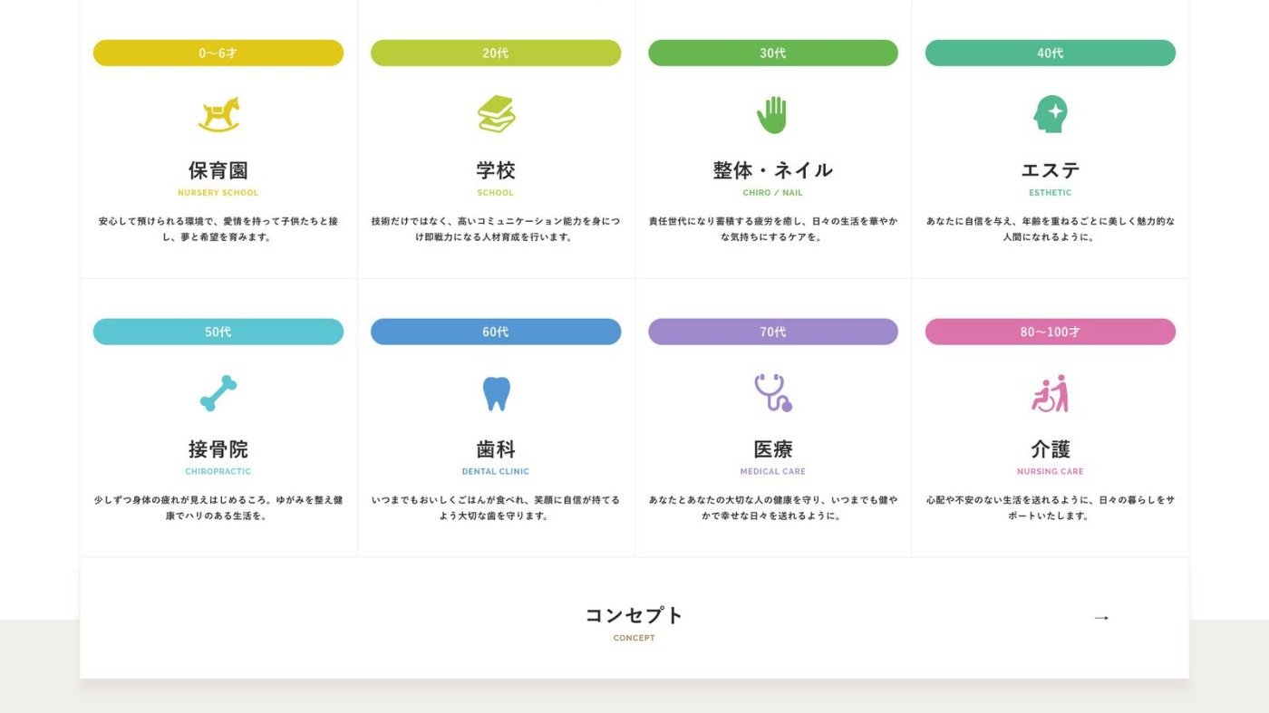 コーポレートサイトとしての役割の中にも、中心軸である整体事業へのユーザーの流れを考慮しファーストビューに需要の高い関連メニューを抜き出して配置しました。