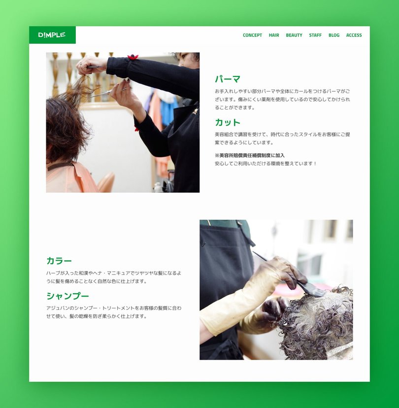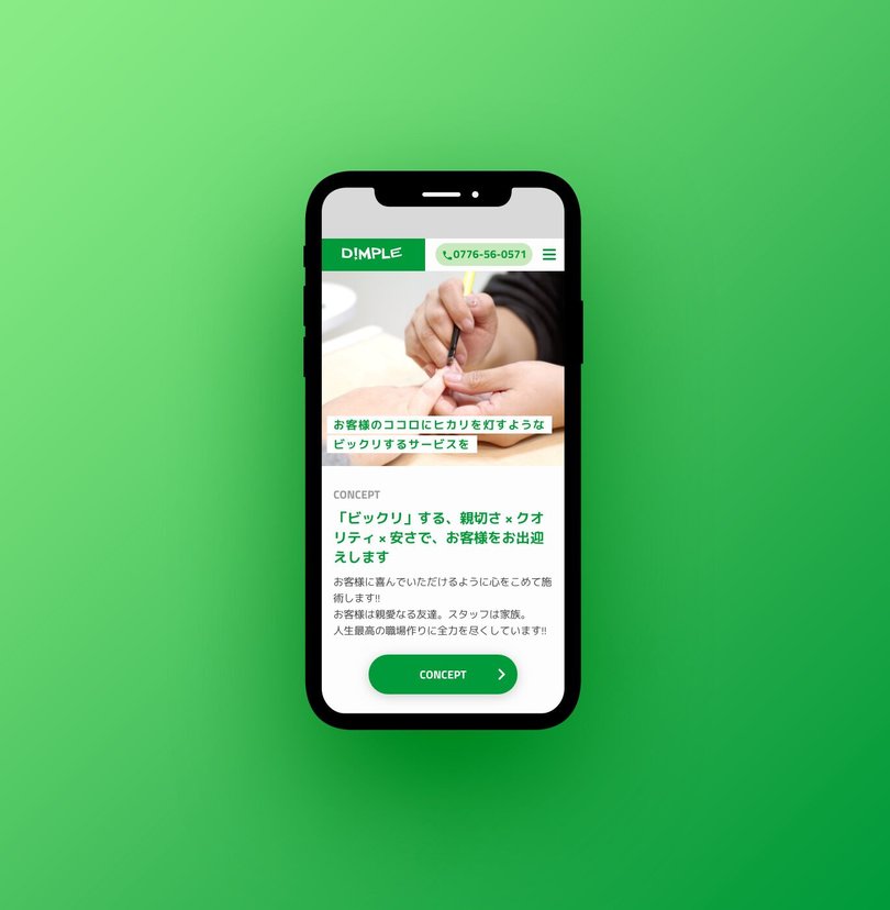 地元の方に長く愛されている美容室。ディンプル美容室のウェブサイトは、見る人の年齢幅も広いことから、シンプルで見やすいデザインにしました。また、スタッフの写真とメッセージでお店のほっこりした雰囲気が伝わるり様々なサービスがあることが伝わるようにしました。 ロゴマークも元気をもらえて活気のある美容室であることが一目でわかるよう、びっくり箱と笑顔をモチーフに新しくリニューアルし、ウェブサイトでデザインにとっても印象に残りやすいように工夫したポイントになっています。 当初、予約フォームなどの設置も考えましたが、メールをチェック・返信などのが負担になるかもしれないため、LINEにお問い合わせ・予約などを集中させ、簡単に返信などできるようにしました。