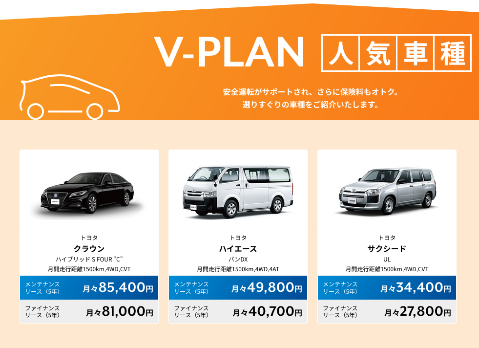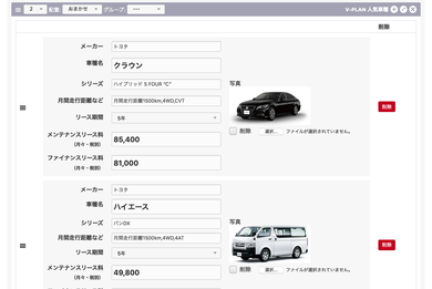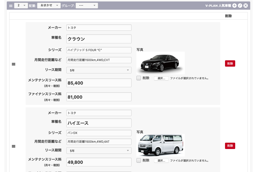 人気の車を低価格のリースで提供するビジネスパッケージ「V-PLAN」は、定期的に新しいパンフレットが刷新され、さらにウェブサイト上に直接表示する「人気車種」も更新が必要でした。人気車種は手軽に更新できるよう「カスタムユニット」を利用し、複数の情報が登録できるオリジナルのカスタムユニットで管理し、掲載順の変更も容易にしました。