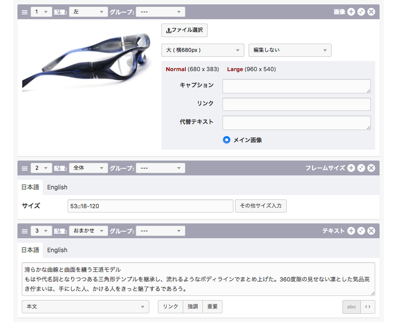 サイズ等の共通の情報は、カスタムユニットで英語タブの入力欄が空のときは日本語の情報を表示するようにカスタマイズ。英語タブに入力があった場合のみ日本語の情報を上書きします。