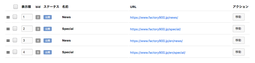 「お知らせ」は日本語と英語で完全に別の情報だったため、それぞれを個別の子ブログにしました。 ここで問題となったのが 子ブログで同一のブログコードを使用できないということでした。 ですが、日本語も英語もお知らせは「news」にしたいのです。そこで、ブログコードを以下のように設定しました。