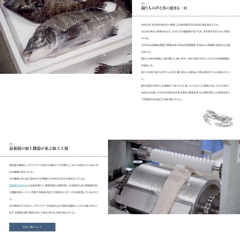 ファーストビューでは、仕入れ(競り)から加工、製品の出荷、そしてお客様の食卓に製品が届けられるまでの動画を設置し、「食卓の笑顔が見られるように皆様へ元気をお届けする」という企業理念をユーザーに伝える工夫をしています。 また「こだわり」ページでは「仕入れ」「加工」「配送」「笑顔の食卓」と言う4つのセクションで区切り、動画とドキュメンタリー形式の文章で、各セクションのこだわりをユーザーに対して訴求しています。