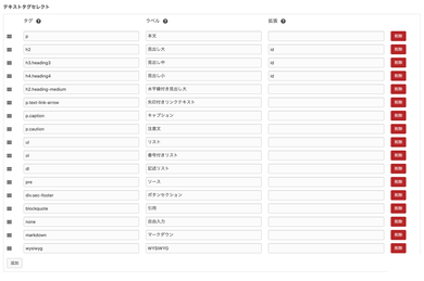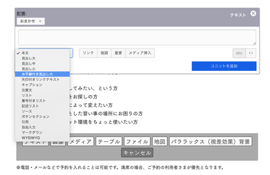 前述したパララックスユニット・設備ステッカーユニットだけでなく、複数の外観をもつ見出しにも拡張ユニットやテキストタグセレクトで対応しています。同じ「大見出し」でも、使用箇所によって外観を変えたいことはよくあること。デザイン・HTMLコーディング時に生じたいくつかの見出しのバリエーションを簡単にユニットとして挿入できるようになりました。
