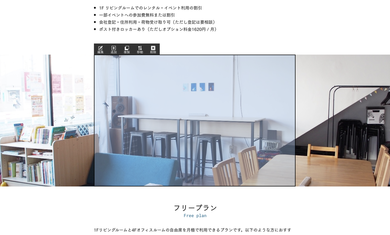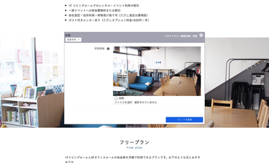 おなじく、上記のパララックス(視差効果)画像もこのサイトを特徴づけるものですが、これもユニット化してあります。コワーキングスペースのサイトにとって大切なのはできる限り今の状況を捉えた、フレッシュな写真を印象的に見せること。こうした大きなイメージもユニット化することで更新を容易にできました。