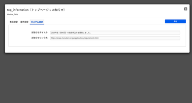 また、ちょっとした更新が必要な箇所は「モジュールフィールド」や「カテゴリーフィールド」によりカスタムフィールドを設定することができるので、トップページの「おしらせ」や、カテゴリートップ画面のリード文を変更したいといった要望にも簡単に応えることができます。さらに閲覧ページ上でマウスオンで変更ボタンを表示できるので、視覚的に変更箇所が分かりやすくなっています。