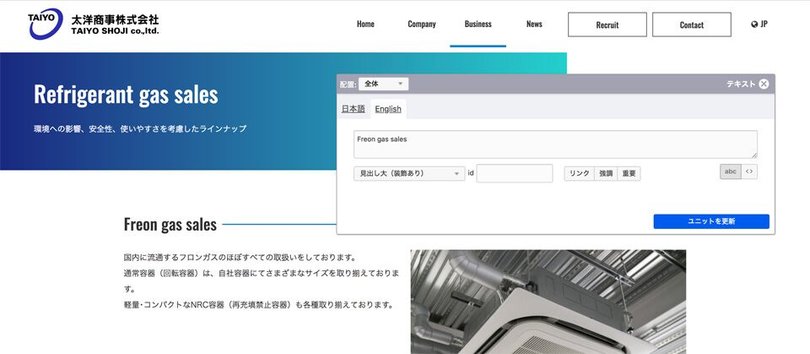 !クライアントさまに海外拠点があるため、英語での情報発信ができるようにa-blog cmsの多言語ユニット機能を導入して日本語・英語の2言語に対応しました。