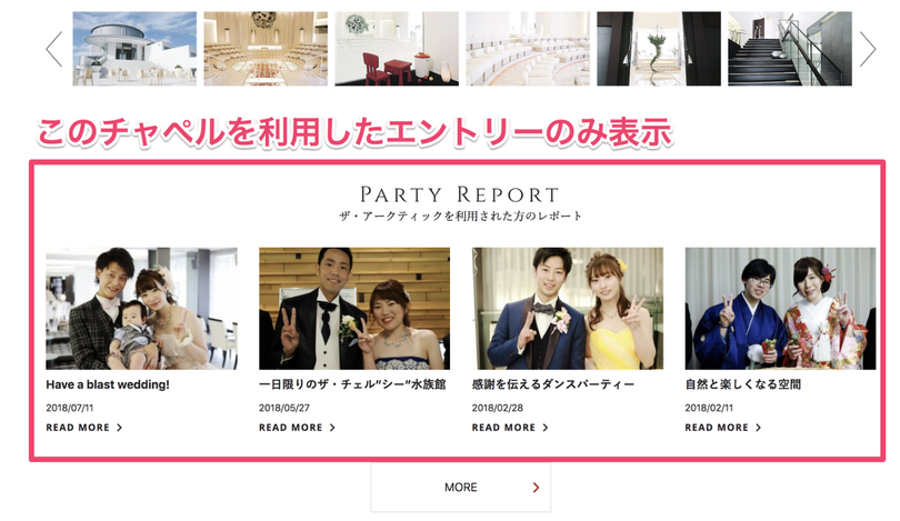 また、チャペルの紹介ページでは、そのチャペルを使用したユーザーの声(レポート)を掲載しています。ここも、レポート全体の最新情報ではなく、「このチャペルを使った」レポートに絞り込んで関連度合いを高めています。 この絞り込みにはカスタムフィールドを使用しました。