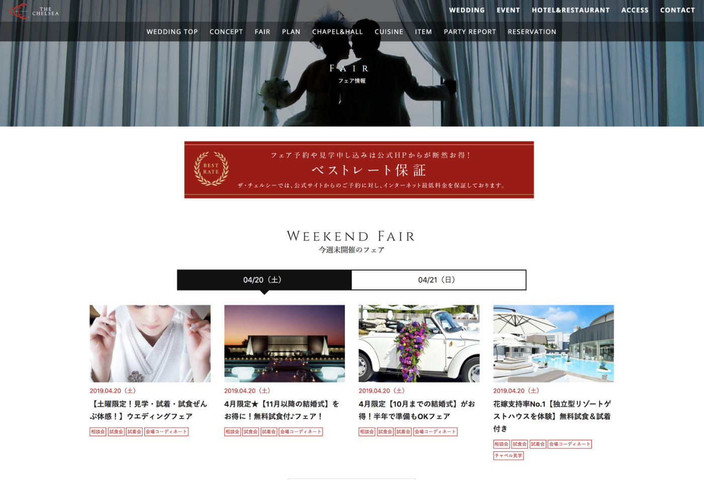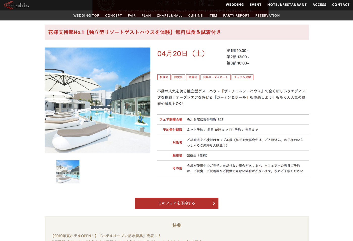 サイトのコンバージョンとして最も重視しているのが、ウエディングフェア情報です。リニューアル前にも予約システムがありましたが、導線を改善したシステムを構築しました。 ※フェア情報はアップルップルさんにカスタマイズを依頼いたしました