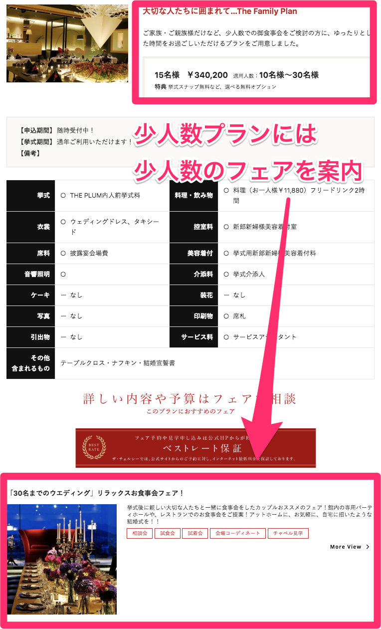 他コンテンツへリンクを貼る際は、「最新エントリーから○件」などとはせず、そのコンテンツになるべく関連するエントリーを表示させています。 例えば、ウエディングプランと関係の深いフェアを、「関連エントリー」の機能を使って手動で選択できるようにしました。