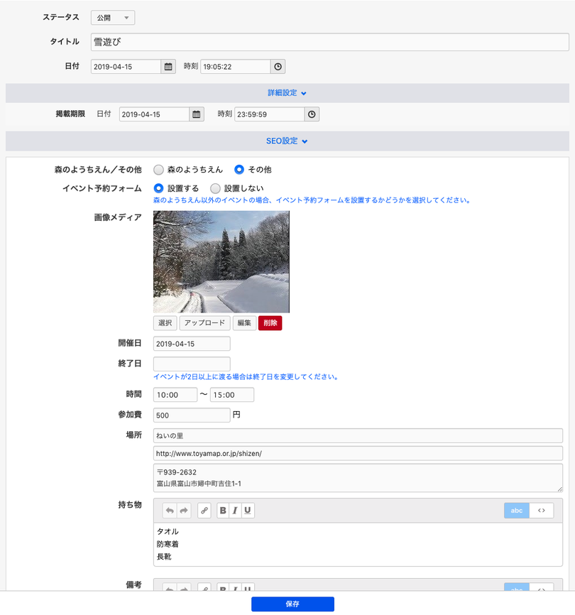 このお悩みを解決するため、イベントに必要な情報をカスタムフィールド に入力できるようにしました。JSで開催日と日付、終了日と掲載期限が同期するようになっています。イベント一覧で日付直近順でソートすることができ、イベントが終了する日には自動的にイベントが非公開になります。