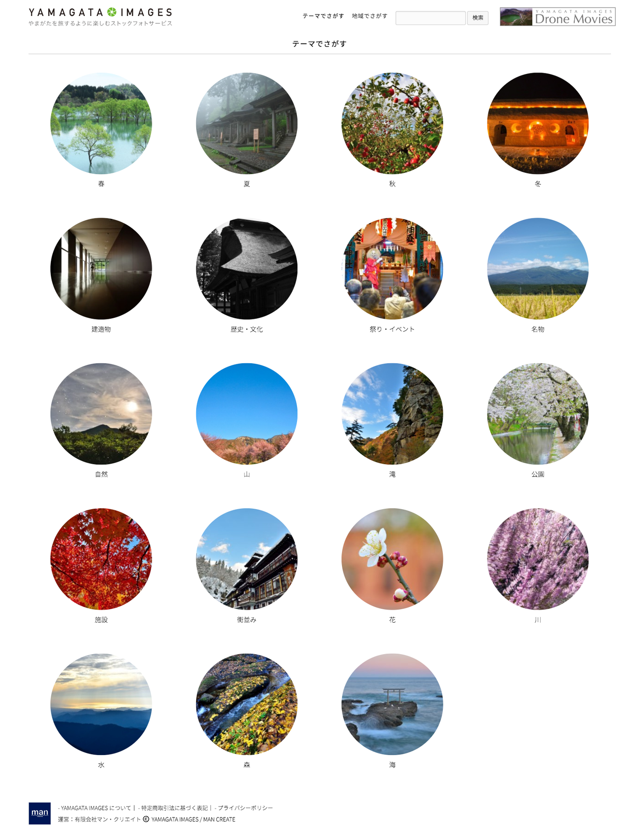 ストックフォトの検索はキーワードだけでなく、山形県の4つの地域(村山・置賜・庄内・最上)別、やまがたの春夏秋冬・建造物・歴史文化・名物・自然(山・滝)などの各ジャンル別に、写真の閲覧が可能です。写真のほとんどは山形県内で撮影されたものや山形の食などが多く、撮影場所の市町村も明記しました。観光客へのアクセス案内や写真愛好家へのロケーションサービスを充実させることで、山形の観光資源の見直しや再発見に寄与します。