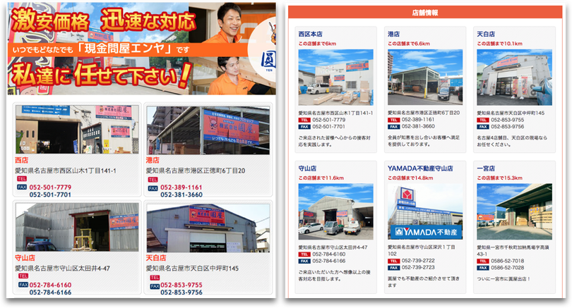 サイトリニューアル後に電話自体の件数は、残念ながら増加しました。理由としては、サイトをリニューアルしたことでアクセスボリューム自体が増えたため、電話の総数自体が増えたからです。結果としては、GeoLocationを使うことで、日々変わる現場で急ぎで必要となる資材を近くのお店で調達できるようになり、多店舗展開の利点を生かしたお店の紹介が可能な仕組みになり、お客さんが増えたので嬉しい悲鳴となりました。