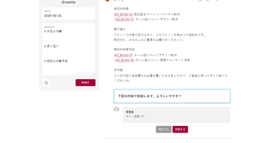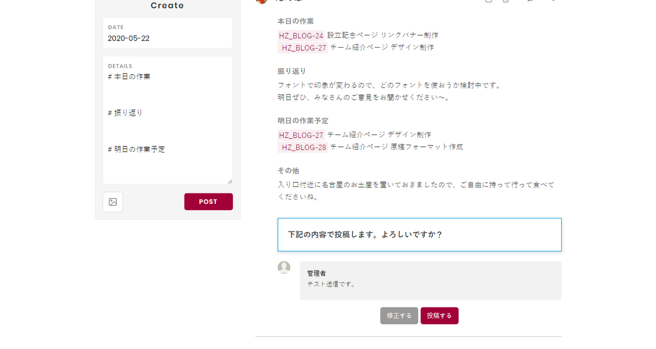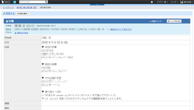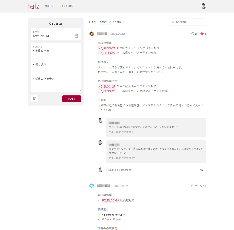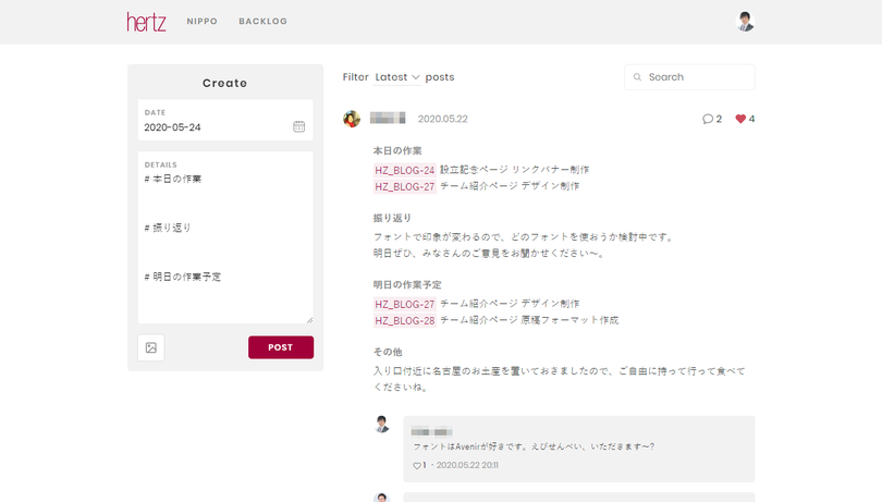 ヘルツでは業務終了後に日報を提出し、メンバー間でリソース状況や案件進行上の問題を共有しています。作業報告だけでなく、日々の気付きや身の回りのトピックスも書くことで、それに対していいね!を付けたり、コメントをやりとりしたり、社員間のコミュニケーションを取るうえで、重要な存在になっています。