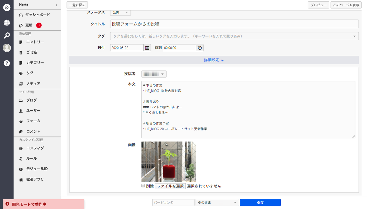 フォームから日報を投稿すると、Form2Entryによりエントリーとエントリーのカスタムフィールドとして管理画面に格納されます。本文は a-blog cms に標準で備わっている、テキストをMarkdown形式で出力する校正オプションを使い、馴染みの深いフォーマットで入力できるようにしました。(さらにBacklogの課題番号は自動的にリンクが貼られるように工夫しています。)