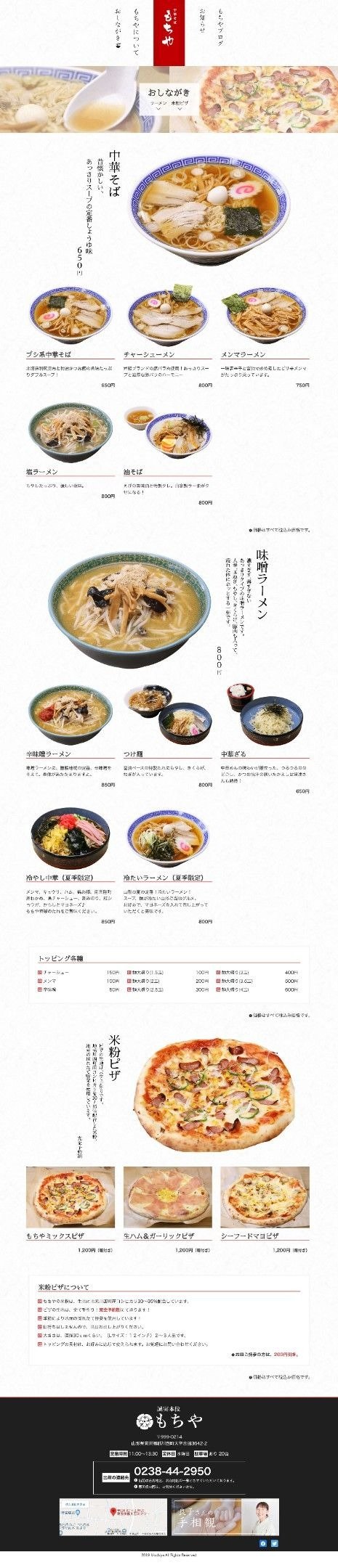 もちやさんは、ご家族で経営されているラーメン屋さんです。 ウェブサイトのコンテンツは少なく、お客さまが行う更新は「お知らせ」「もちやブログ」「良子さんの手相観」になります。