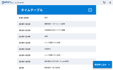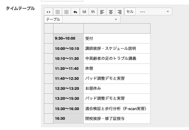シューズフィットアカデミーでは、足の悩みを解決するために靴販売店や靴メーカー、フットケアや靴調整に興味のある方を対象とした少人数講座を行っています。 より簡単に更新ができるよう、講座のタイムテーブルは「テーブルユニット」を利用し、Excelで管理された講座情報(時間や詳細)の登録を簡略化しています。a-blog cms テーブルユニットのExcelから表をそのままコピーしてペーストできる機能を活用しています。