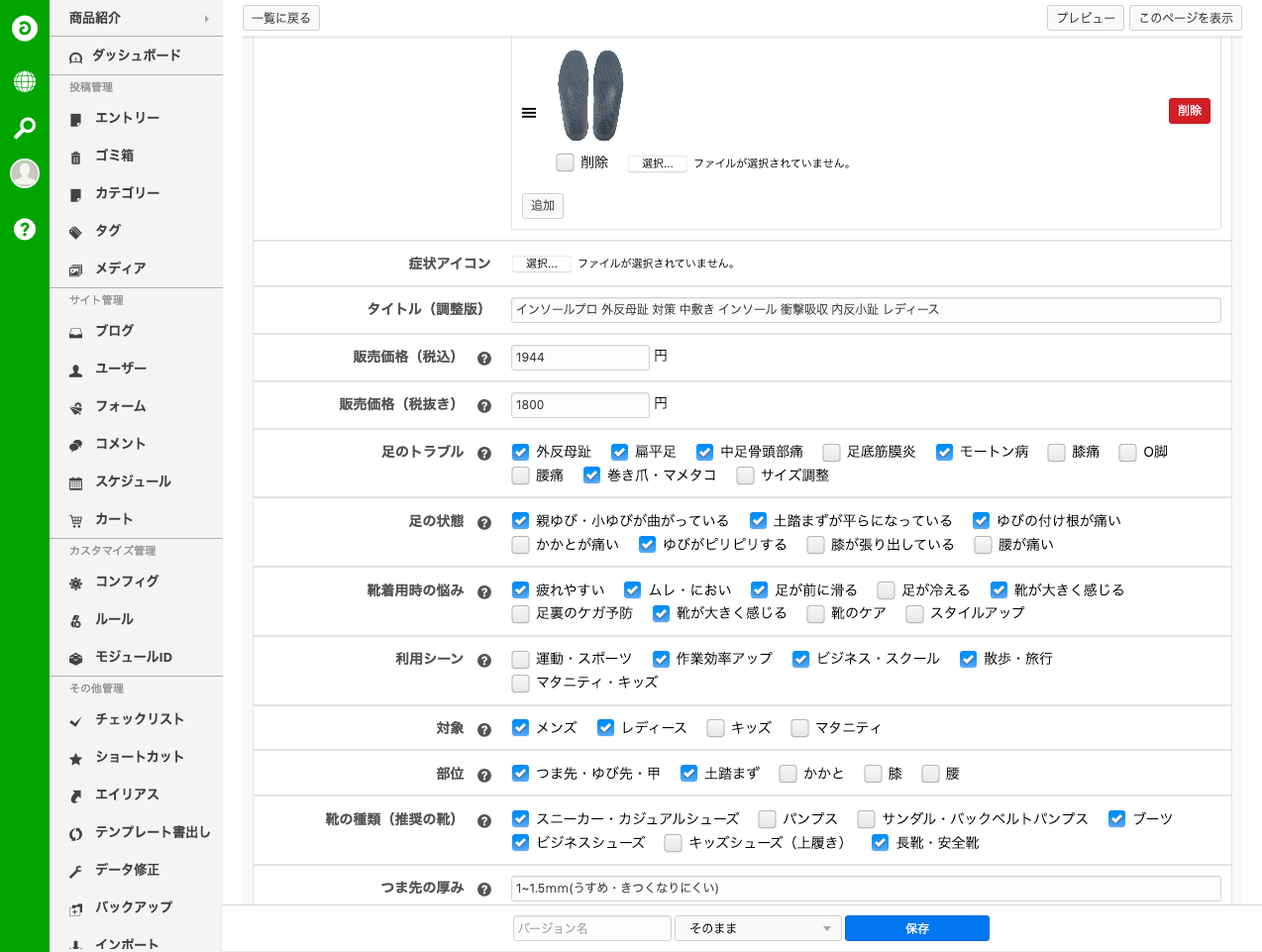 ちなみに、管理画面もクライアントが登録・更新しやすいよう工夫をしています。商品一つひとつは、エントリーで管理しており、新商品が登場したり商品に変更があった場合でも、クライアント自らで対応できます。入力欄をチェックボックスやセレクトボックスにすることで、リテラシー高くない担当者でも簡単に商品を追加・修正・更新ができるようにしています。