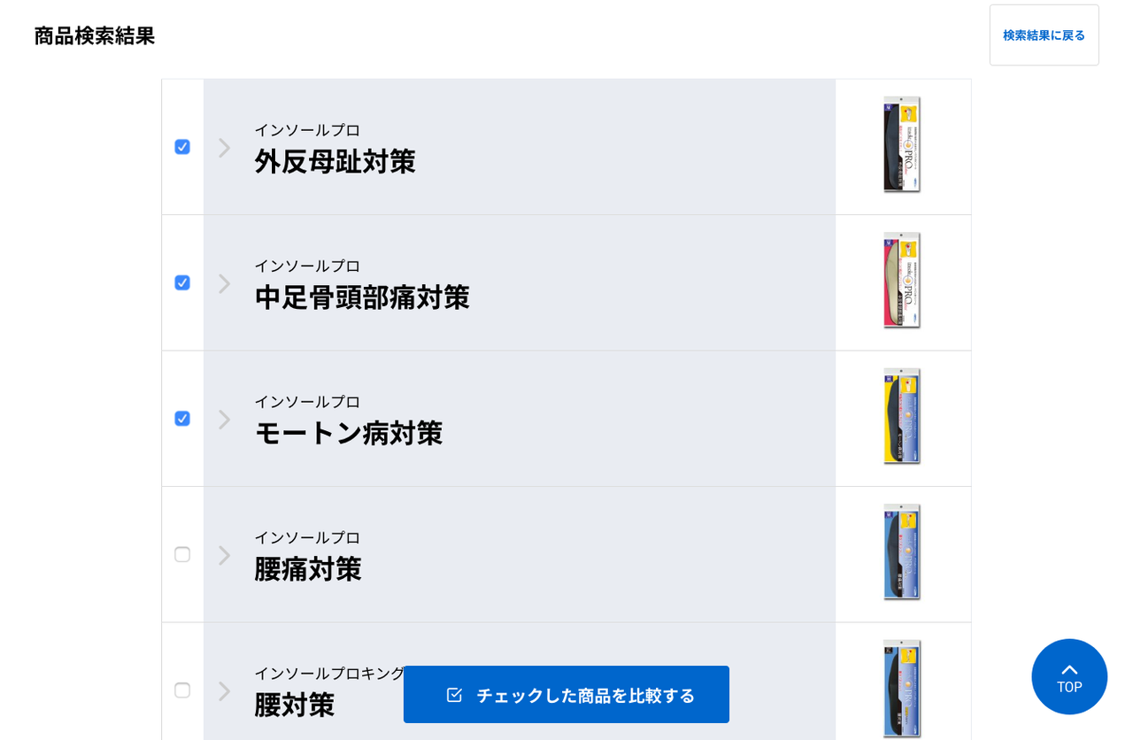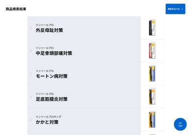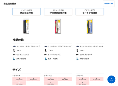 そのため、ユーザーにより興味を持ってもらえるよう作成したコンテンツが「足裏先生の問診」と「アイテムサーチ」です。どちらも、ゲーム感覚で気軽に診断ができ、結果ページにはおすすめの商品がピックアップされています。ピックアップされる商品は、商品紹介と紐づけられているため管理がしやすくなっています。