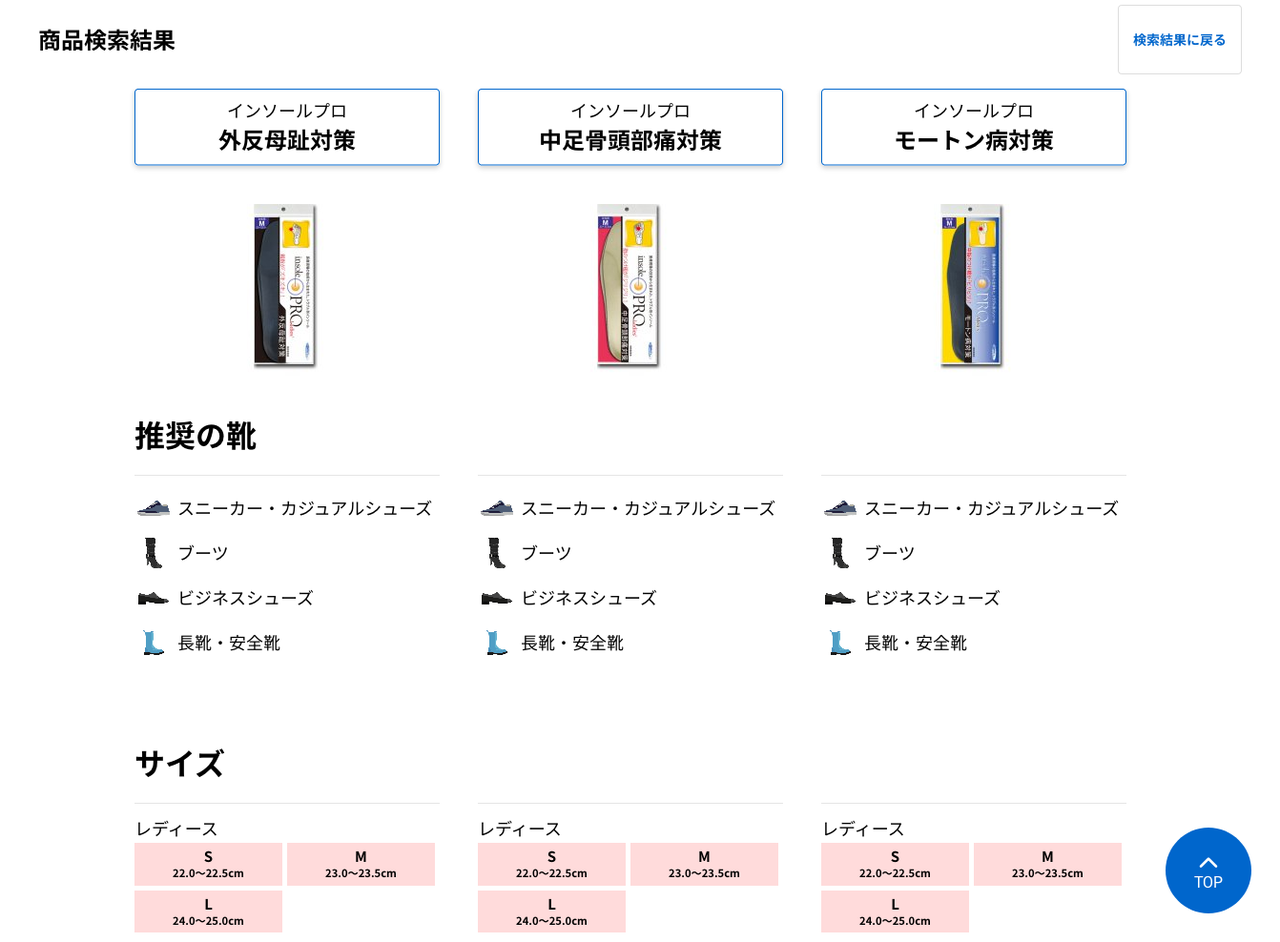 Shoesfit.comの商品は、80種を超える多彩なラインナップを扱っています。ユーザーが商品を探しやすいよう、その特徴や利用シーンなどをカスタムフィールドで細かく設定。カスタムフィールド検索により、様々な条件(靴の種類、足の悩みや利用シーンなど)で商品が検索できるようになっています。検索結果には画像付きで表示されるので、実物のイメージがしやすくなっています。