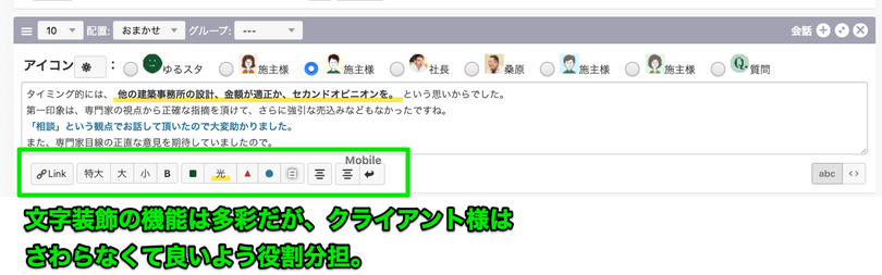 このように役割分担しました。 侘蔵さまは臨場感ある施主さまとの対話を「会話ユニット」という、専用のカスタムユニットに入力いただくだけでOKです。 前述の「機能の出し分け」が細かく設定できるので、余計なボタンや機能は極力出さないよう、管理画面を作ることができました。
