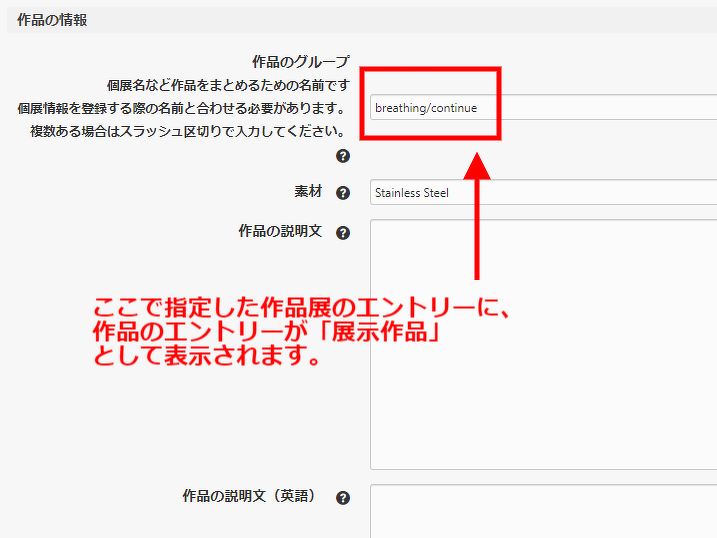 管理画面側では、「作品」のエントリーに用意したカスタムフィールドに、表示させたい「作品展」のエントリー名を入力して頂く事で、表示が可能になるようにしています。