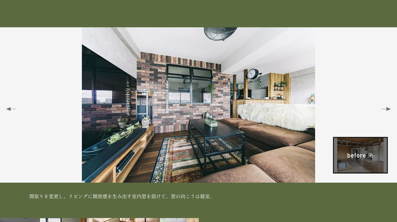 「リノベーション」という概念はここ数年で浸透しているので、もはや説明は不要ですが、まだ「リフォーム」と認識が混合している人もいらっしゃるかと思います。リノベーションでは「暮らしを総合的に豊かにする」ために、家の中の複数箇所を一度に施工します。複数の施工箇所に対して、施工前(Before)の写真も掲載可能にすることで、ナチュリエリフォームの良さを存分に引き立たせました。