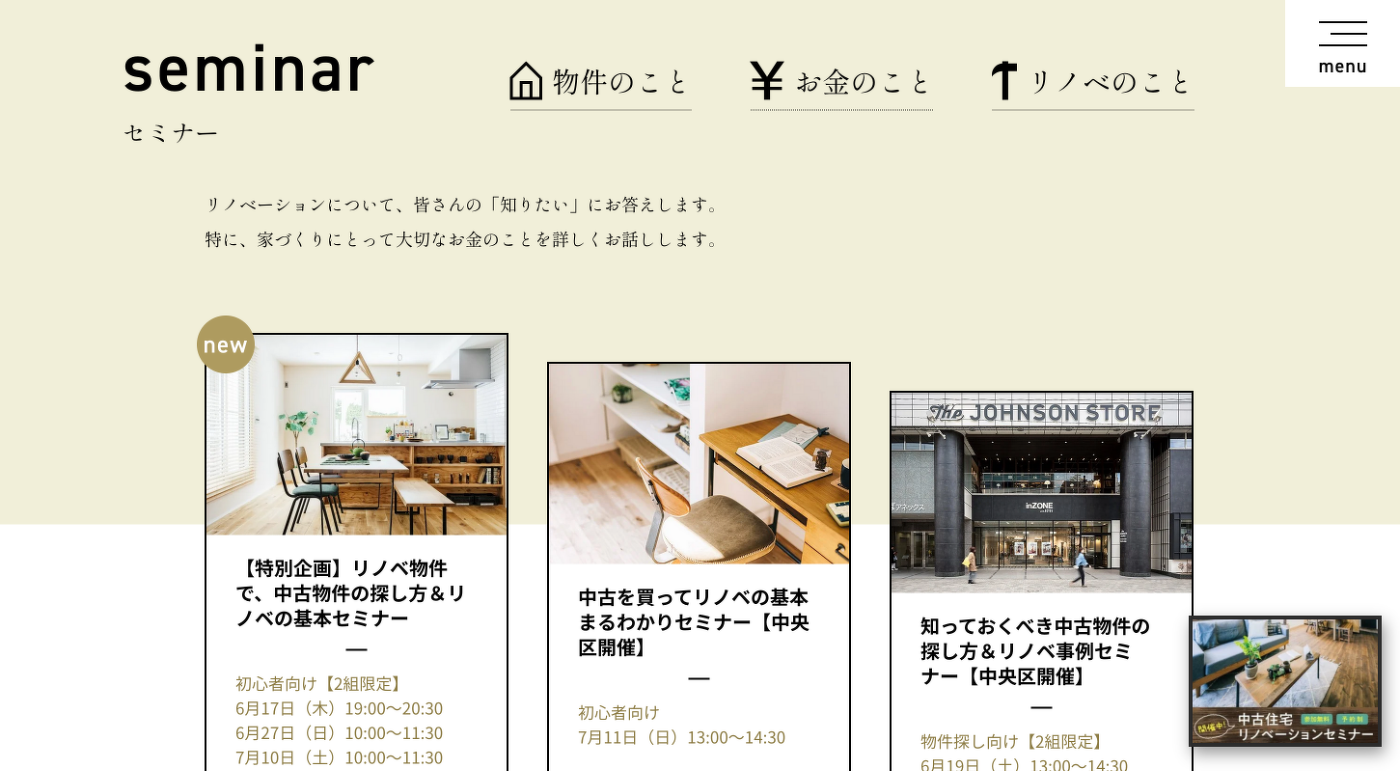 「イベント」や「セミナー」といった集客にも関わるコンテンツは、トップページで積極的にPRしていく必要がありました。画面右下のフローティングバナー(スクロールしても着いてくるバナーリンク)は、クライアント様が好きなタイミングで自由に更新できるようバナーモジュールを活用しています。