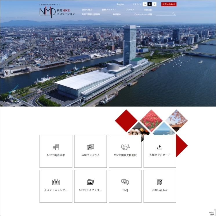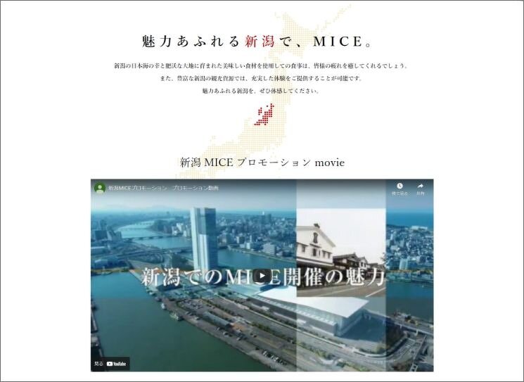 新潟県からの依頼で、新潟県内のMICE施設情報を掲載したホームページを制作しました。 このサイトは学会や各種イベントを企画予定の方に向けて、新潟の各種施設の情報をはじめ、補助金情報や新潟の魅力を発信し、国内だけでなく世界からもコンベンション誘致を図っています。