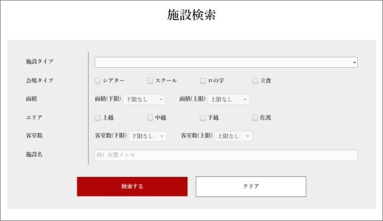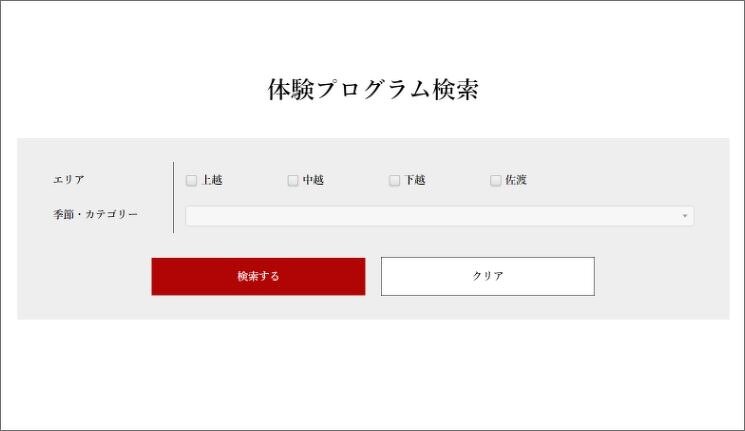 先方からの要望で、施設や体験プログラムなどをユーザーが絞りこんで検索できる機能を付けてほしいとのことでした。そこで検索機能を活用し、施設情報と体験プログラムそれぞれに検索ボックスを設置しました。 会場のタイプや面積、季節などで細かく絞り込むことができるようになっています。