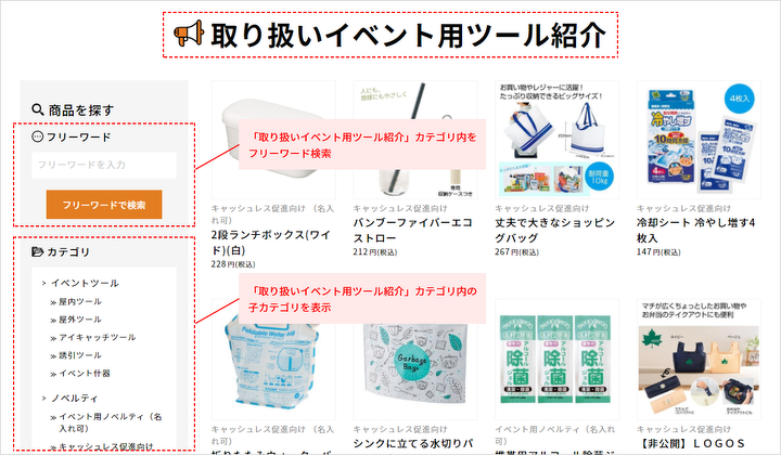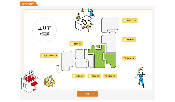 カテゴリ毎に商品数がとても豊富なため、サイト全体ではなくカテゴリ内で検索できる機能を設けることで迷うことなく操作ができるようにしました。子カテゴリも表示できるようにし、商品分類を一目で把握しやすくなっています。 イベントスペースは全国地図からまずは地域を選べるようにする、検索結果が0件の場合はお問い合わせに誘導する、など、直感的に操作できるよう設計しました。