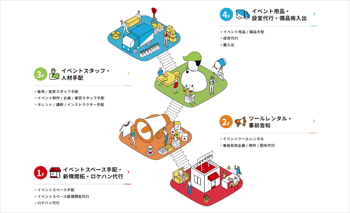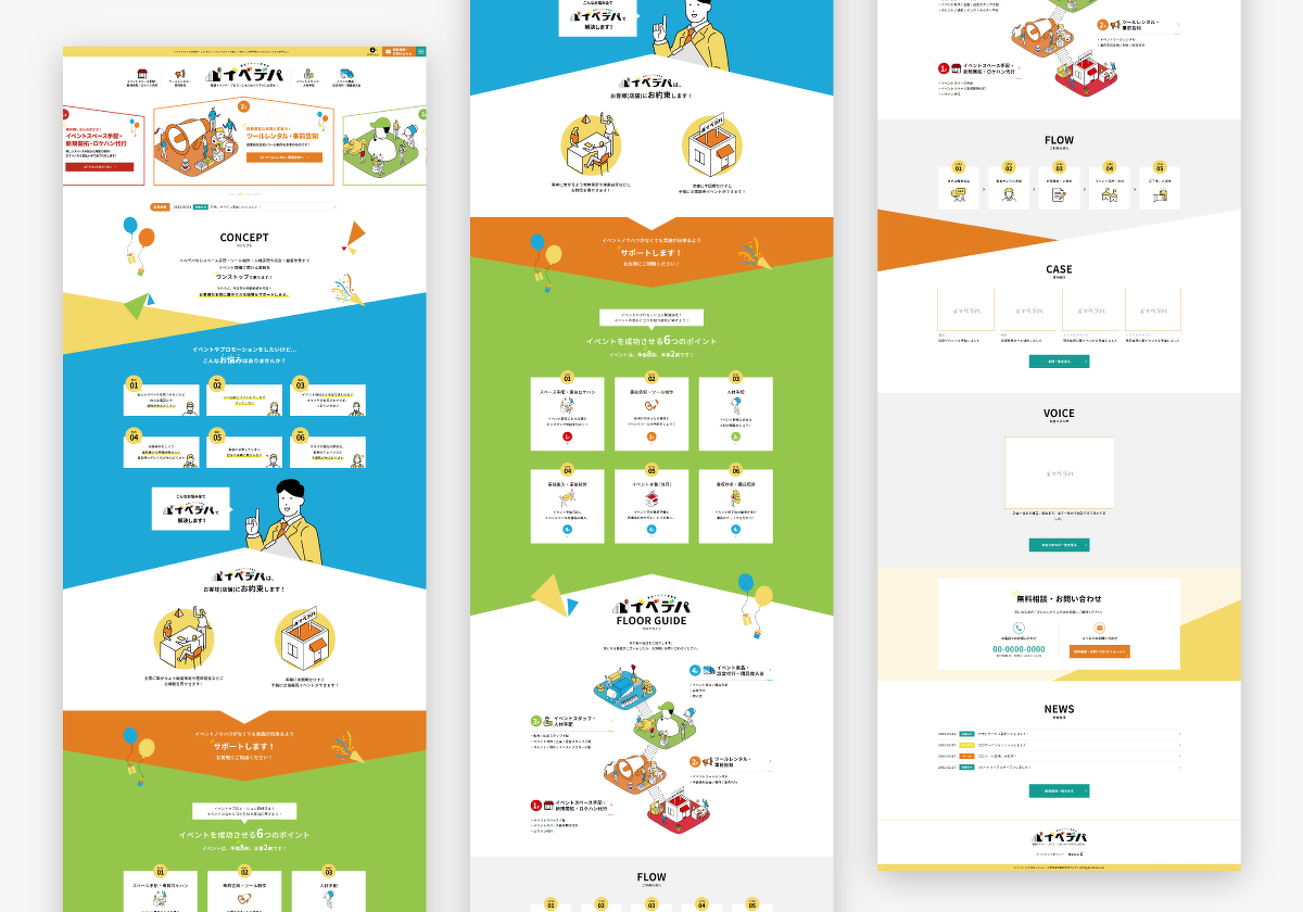 イベントプロモーションのための情報サイトのため、サイト自体をデパート・イベント会場のようなデザインに。豊富な商品を扱っているためカラフルに、また、たくさんの代理店から親しまれるように明るく楽しいイメージで制作しました。