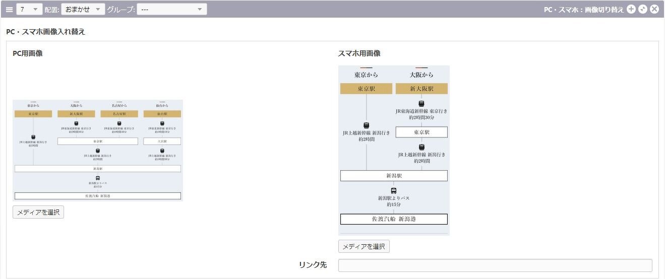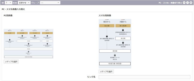 さらに旅館様はイラスト図での説明も入りやすいので、スマートフォンでの閲覧時にストレスがないよう、デバイスごとに画像を出し分けられるようにしています。このようにユニットとグループを工夫することで、各ページをそれぞれに印象的に仕上げることができました。