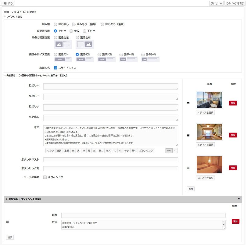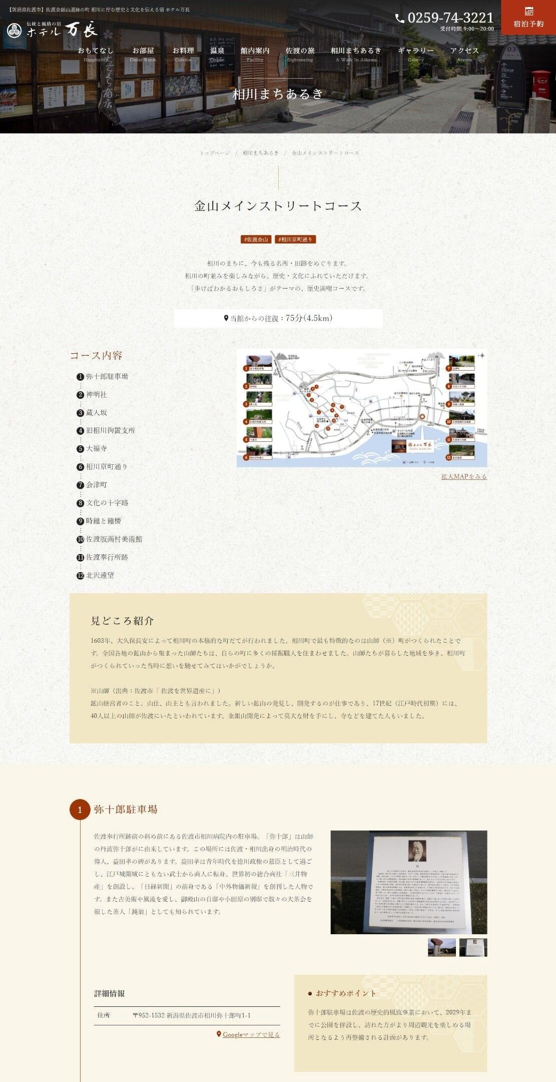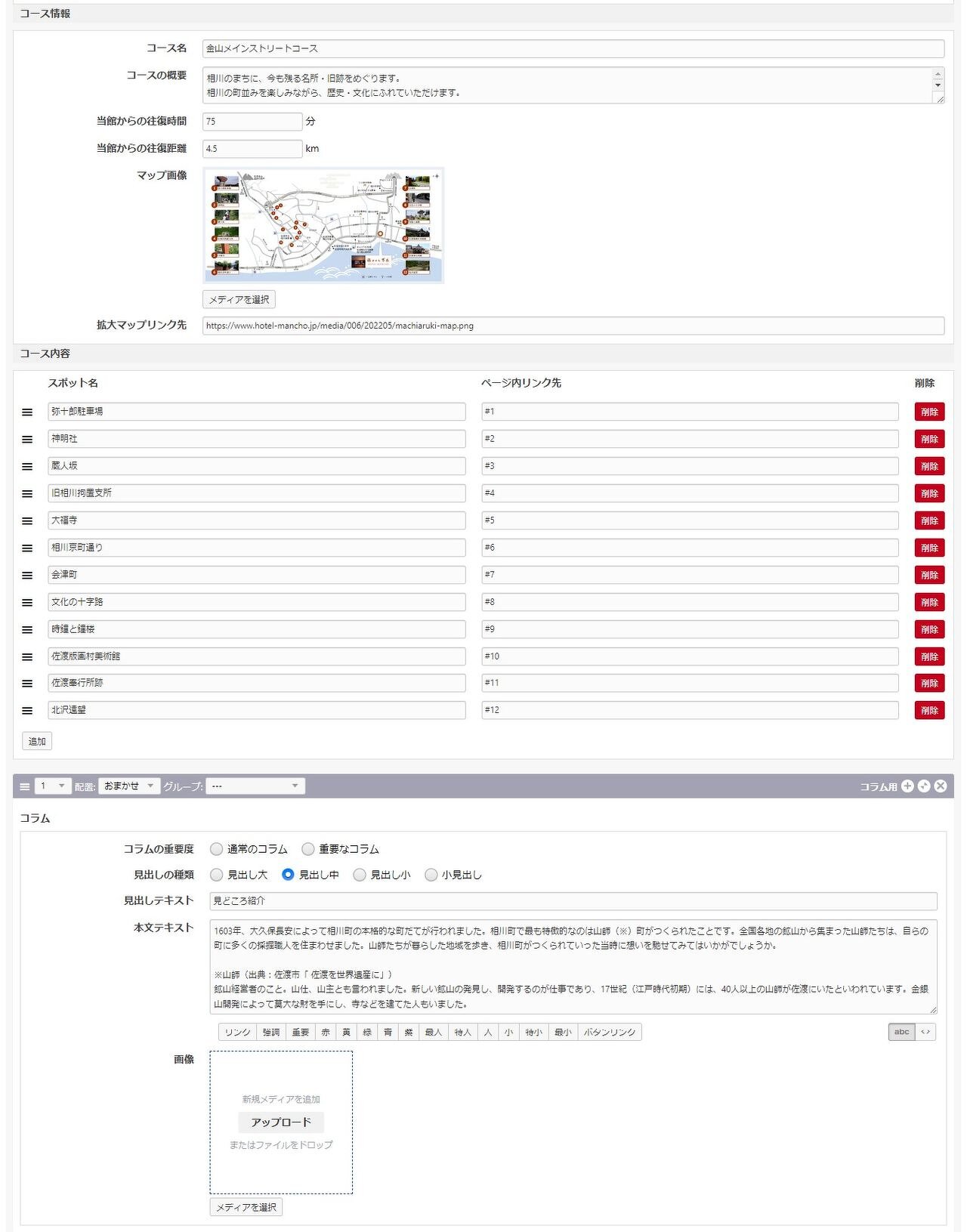 ホテル万長様が力を入れている「相川まちあるき」で新しいコースを追加される際、編集しやすいようにユニットのカスタマイズを行いました。まちあるきの目的地を順に入力すると、自動的に見出し番号が振られます。また上部にページ内リンクを設定するためのパーツを用意。簡単にページ内リンクを設置できるようにしました。