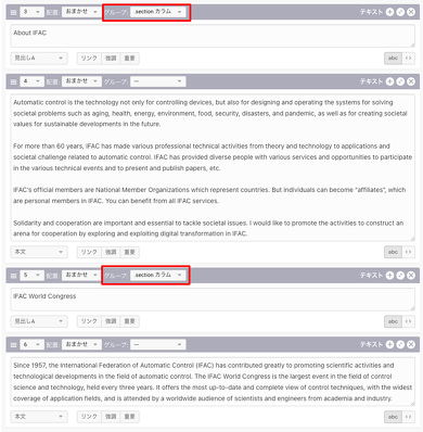 画像の横並びにカスタムユニットを使用することで、セクションごとの色分けを「グループ」で表現できました。