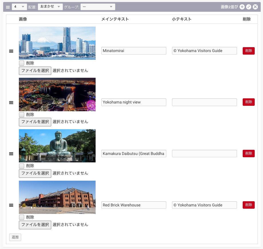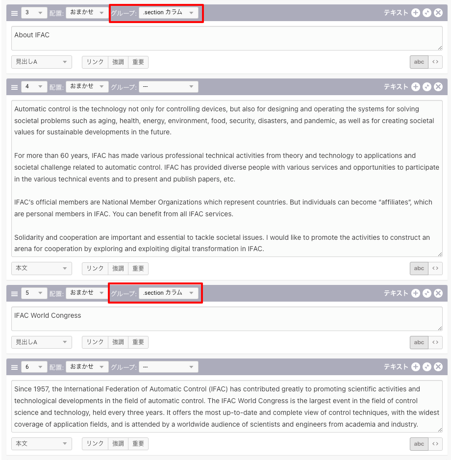 また、更新しやすいように画像の横並びは、ユニットの「グループ」で「2カラム」のように指定するのではなく、カスタムユニットで登録できるようにしました。