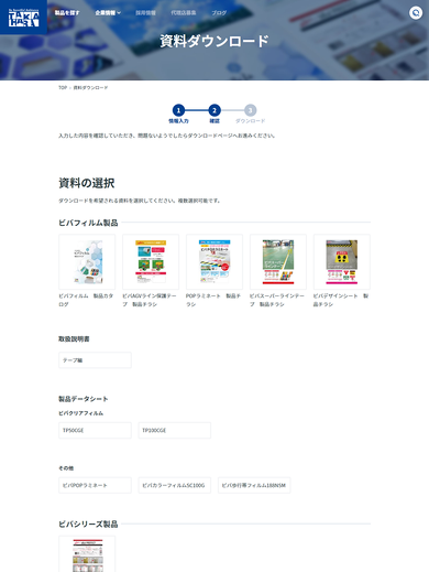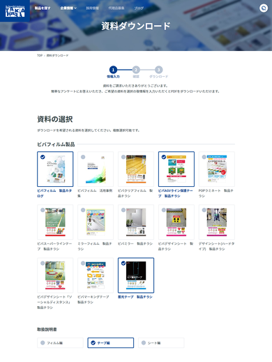 製品カタログやチラシなどを選択して、必要情報を入れていただくと資料ダウンロードができます。 見た目も通常のチェックボックスにせず表紙のビジュアルを見せることで、押しやすくしています。 これにより、目当ての製品以外にも気になる製品を直感的に気軽にダウンロードしていただけることも狙っています。