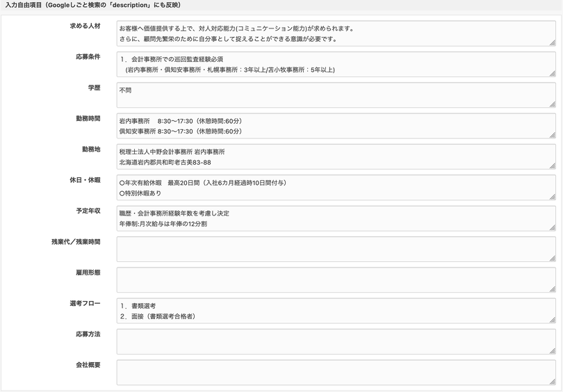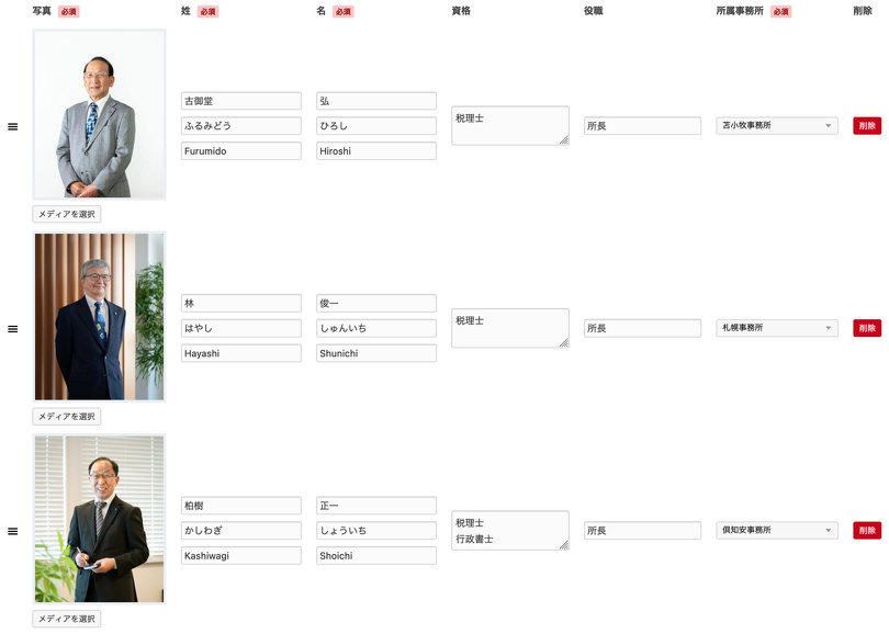 スタッフの情報は入社や資格の取得などによって更新したいタイミングはさまざまです。 そのため、スタッフページはクライアントが自由に更新できる仕組みになっています。カスタムフィールドを使って入力項目を用意してあるので、必要な情報を入力するだけで完成されたレイアウトができます。
