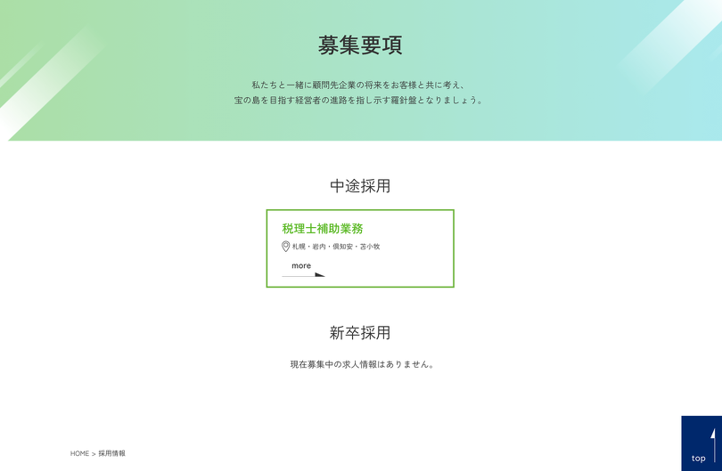 採用ページは、ターゲットに合わせてフレッシュさのあるテイストで作成しています。他のページとテーマファイルを分けて作成し、募集要項はクライアント自身が管理できるようカスタムフィールドで入力項目を用意しました。中途採用と新卒採用どちらも行なっているので、カテゴリーの分岐で表示の出し分けをしています。