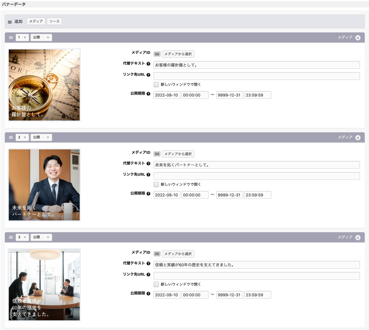 今後は、セミナーによる集客も考えています。そのために取り入れたのが、トップページにあるメインビジュアルのメディアバナーモジュール化です。これによりクライアントによる編集が可能となりセミナーの告知にも役立てることができます。