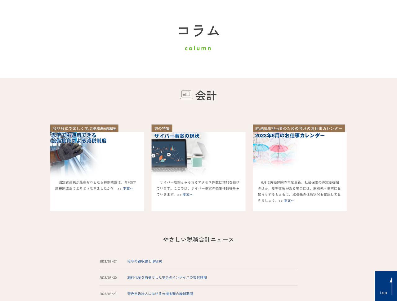 コンテンツマーケティングの一環として、会計、相続、医療業界に向けたコラムを連載しています。連載には外部のシステムを利用していますが、表示にはa-blog cmsのテンプレートを利用して、トップページやコラムページに実装しています。