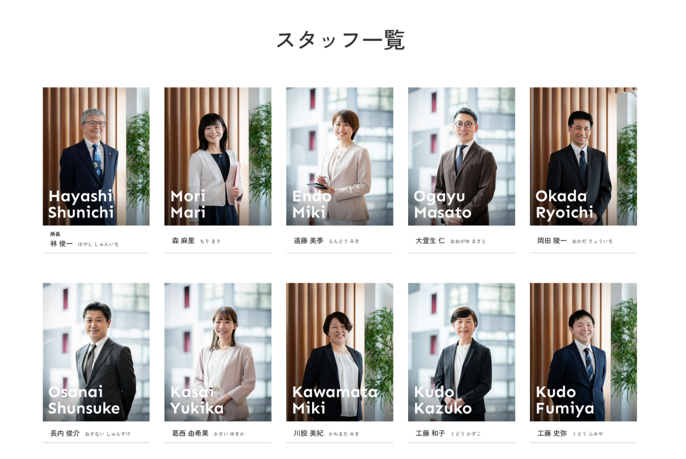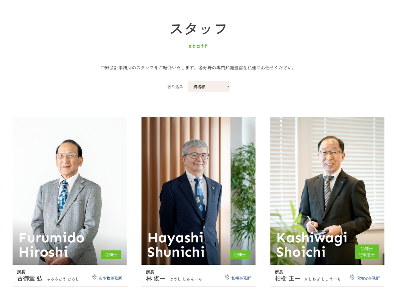 5つある拠点ページでは、拠点ごとに所属するスタッフを表示しています。Ver. 2.8.0から利用できるようになったインクルードの記法でスタッフページで登録した内容を拠点ごとに表示できています。