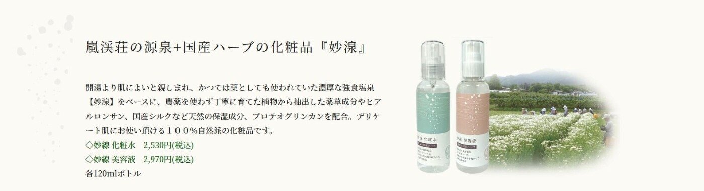 嵐渓荘様は「渓流沿いに建つ一軒宿」としてテレビドラマのロケ地にも選ばれたお宿でしたので、デザインでも「川」のイメージを取り入れました。メインビジュアルでは川のほとりに佇む建物の写真を使用しています。
