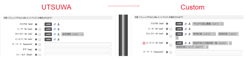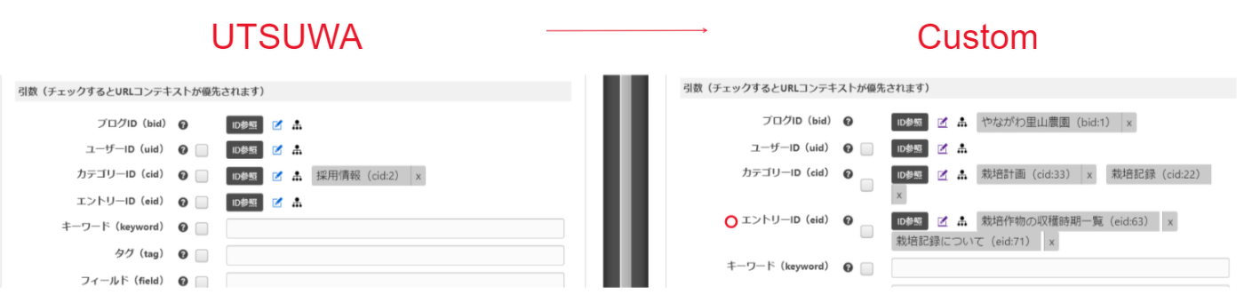 UTSUWAで用意されているモジュールIDの設定は、「採用情報」のカテゴリーのエントリーを表示させるようになっていますが、このテーマでは、任意のエントリーを指定して表示させるようにしています。
