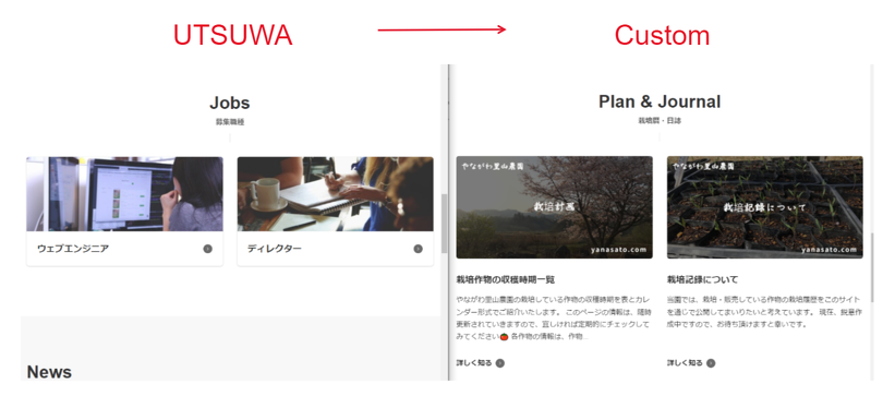 例えば、トップページに表示している「栽培暦・日誌」のエントリー表示の箇所では、UTSUWAのトップページで利用されている「募集職種」のモジュールに少し手を加えて利用しています。