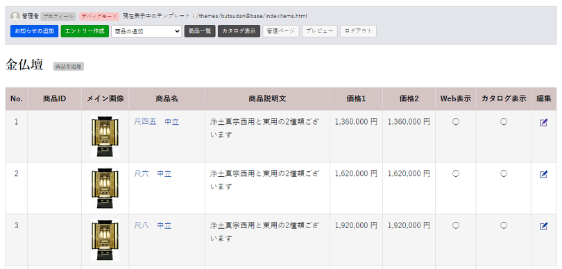 商品の一覧には管理者だけが見える一覧ページを設け、その一覧から商品のデータを編集できるようにしています。