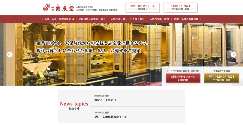 銭辰堂様は江戸時代に創業した老舗で、大阪市内に自社ビルで常時100本以上の仏壇を展示しています。また葬儀を行うことで仏壇を購入するお客さまもいらっしゃることから、ウェブサイト上で仏壇・仏具を売るのではなく、来店者を増やすことが目標となっています。そのため、ウェブサイトの目に見える部分はオーソドックスな作りになっています。