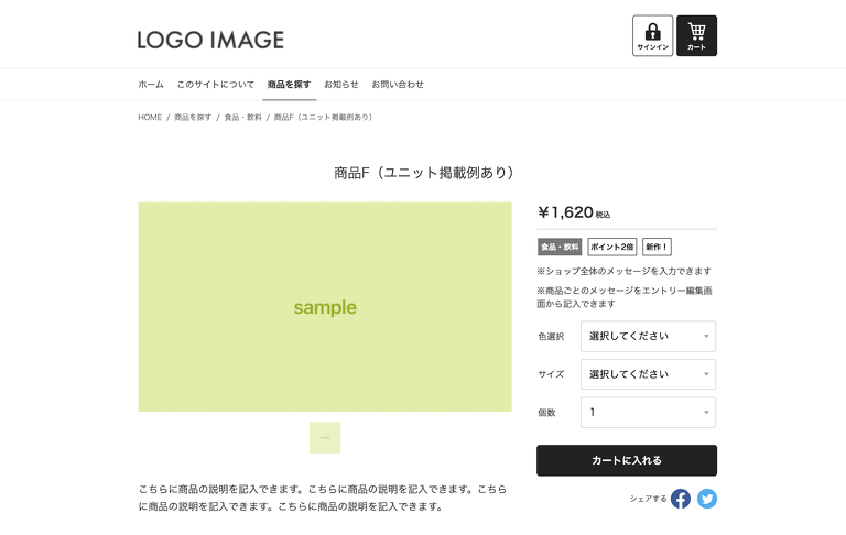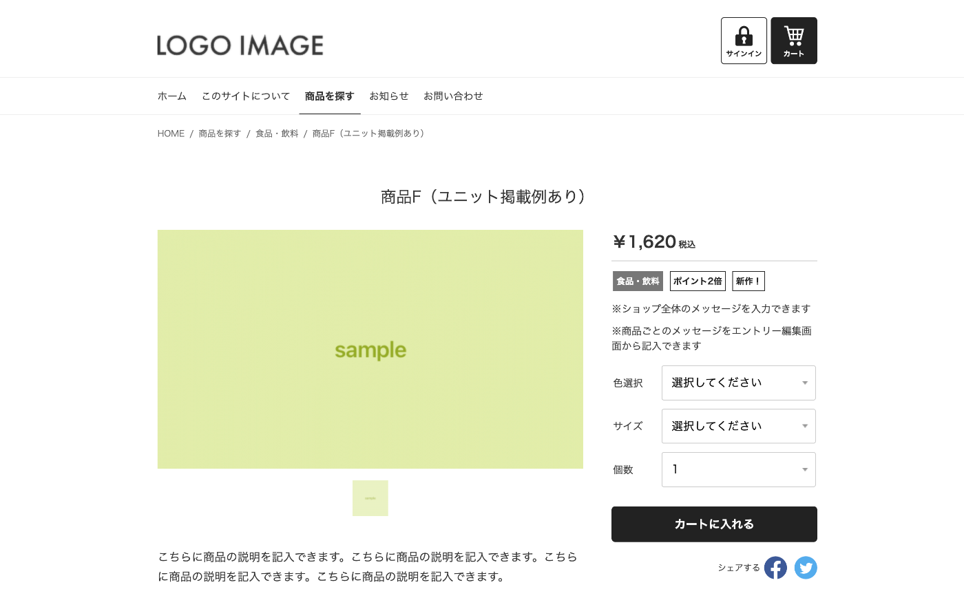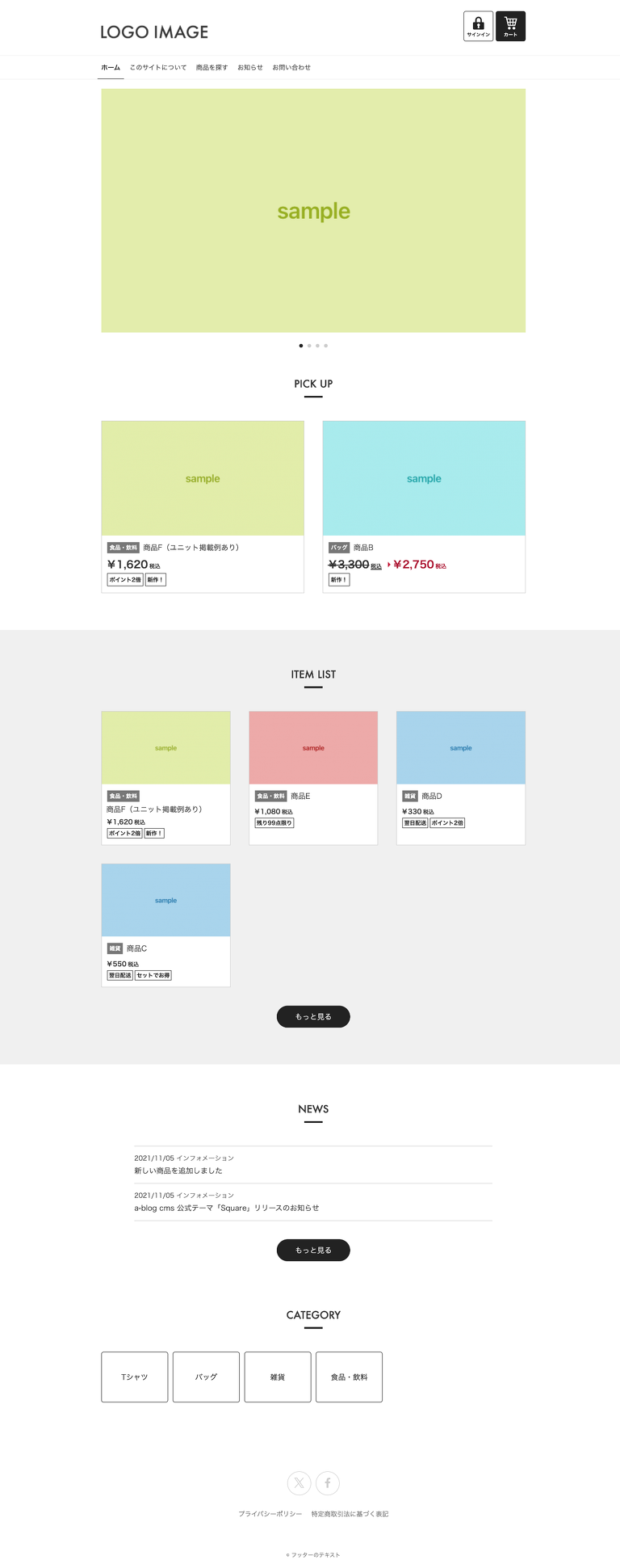 必要なモジュールが予め搭載されており、商品情報を登録するだけですぐにECサイトを始められるテーマです。Shopping Cart 拡張アプリを使用したECサイト制作にご利用ください。