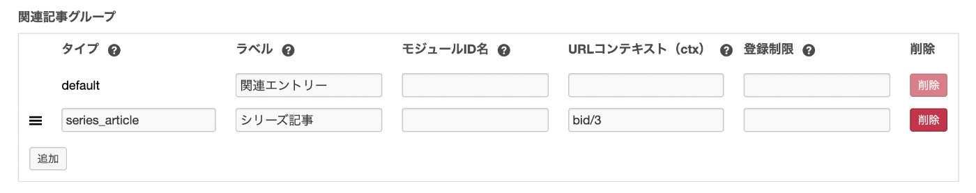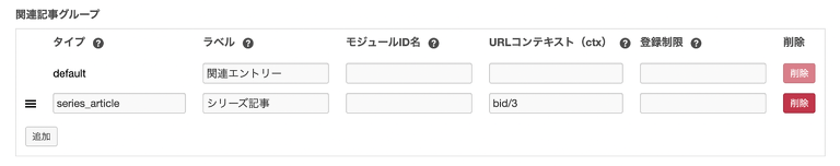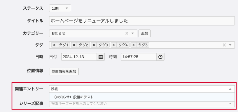 「関連記事グループ」の設定を活用することで、1つの記事に対して複数の関連エントリーをグループ化して表示することが可能です。これにより、カテゴリやトピックに応じた柔軟な関連エントリー表示が実現します。※Admin_Entry_Autocompleteモジュールのみ