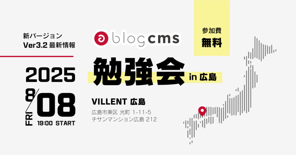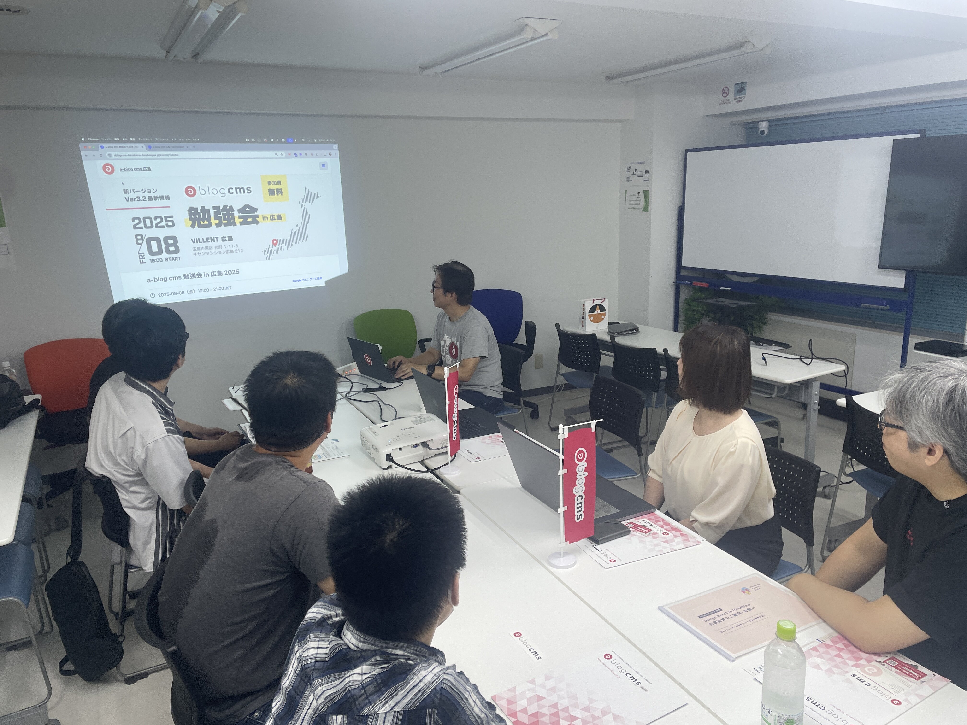 2025年8月8日(金)、VILLENT 広島にて、8年ぶりとなる広島での a-blog cms 勉強会を開催いたしました。今回の開催は、a-blog cms Ver. 3.2 の新しい UI デザイン担当が広島出身であることをきっかけに、勉強会を開催することになりました。